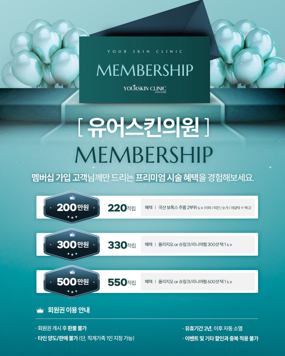 Your Skin Event 유어스킨의원에서 준비한 혜택을 미리 확인하세요. 목록 유어스킨 멤버십 이벤트 페이지 정보 작성자유어스킨의원 작성일2025-07-14 기간2025-07-14 ~ 2026-07-14 조회수49 본문 멤버십 가입 고객님께만 드리는 프리미엄 시술 혜택을 경험해보세요. Location Kakao Map Naver Map Kakao Map Naver Map 녹번역 1번 출구에서 도보 2분 거리 서울특별시 은평구 통일로626 4층 유어스킨의원 02.382.7555 진료시간 *매주 수요일 휴진 월 / 금 am 10:00 - pm 07:00 화 / 목 am 10:00 - pm 08:00 토 요 일 am 09:30 - pm 02:30 (점심시간 없음) 점 심 시 간 pm 01:00 - pm 02:00 Contact Us 02.382.7555 전화 상담하기 카카오톡 상담 카카오톡 상담하기 02.382.7555 카카오톡 상담 블로그 인스타그램 오시는 길