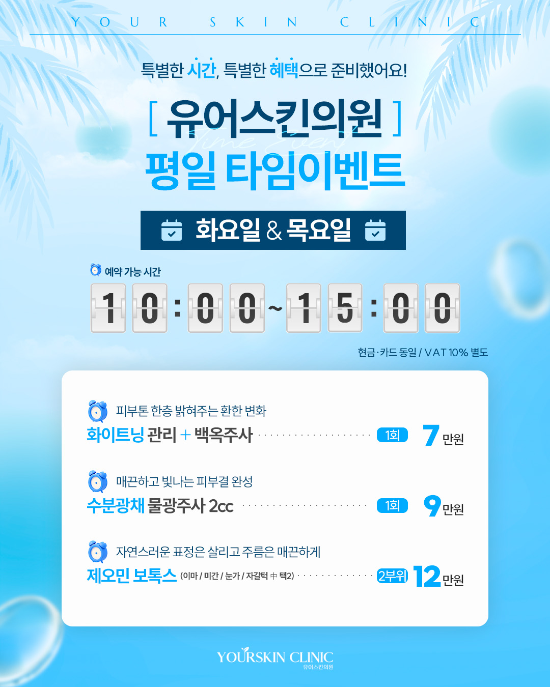 Your Skin Event 유어스킨의원에서 준비한 혜택을 미리 확인하세요. 목록 평일 타임이벤트 페이지 정보 작성자유어스킨의원 작성일2025-07-14 기간2025-07-14 ~ 2025-09-04 조회수97 본문 ⏰ 화·목 10시~15시 한정! 타임 이벤트로 스마트하게 피부 관리하세요. Location Kakao Map Naver Map Kakao Map Naver Map 녹번역 1번 출구에서 도보 2분 거리 서울특별시 은평구 통일로626 4층 유어스킨의원 02.382.7555 진료시간 *매주 수요일 휴진 월 / 금 am 10:00 - pm 07:00 화 / 목 am 10:00 - pm 08:00 토 요 일 am 09:30 - pm 02:30 (점심시간 없음) 점 심 시 간 pm 01:00 - pm 02:00 Contact Us 02.382.7555 전화 상담하기 카카오톡 상담 카카오톡 상담하기 02.382.7555 카카오톡 상담 블로그 인스타그램 오시는 길